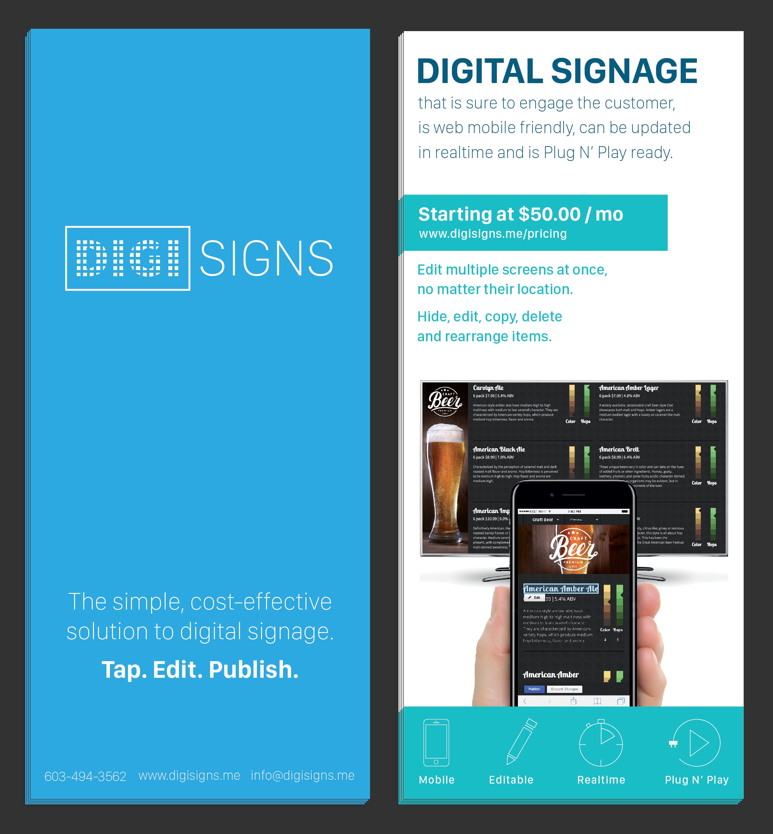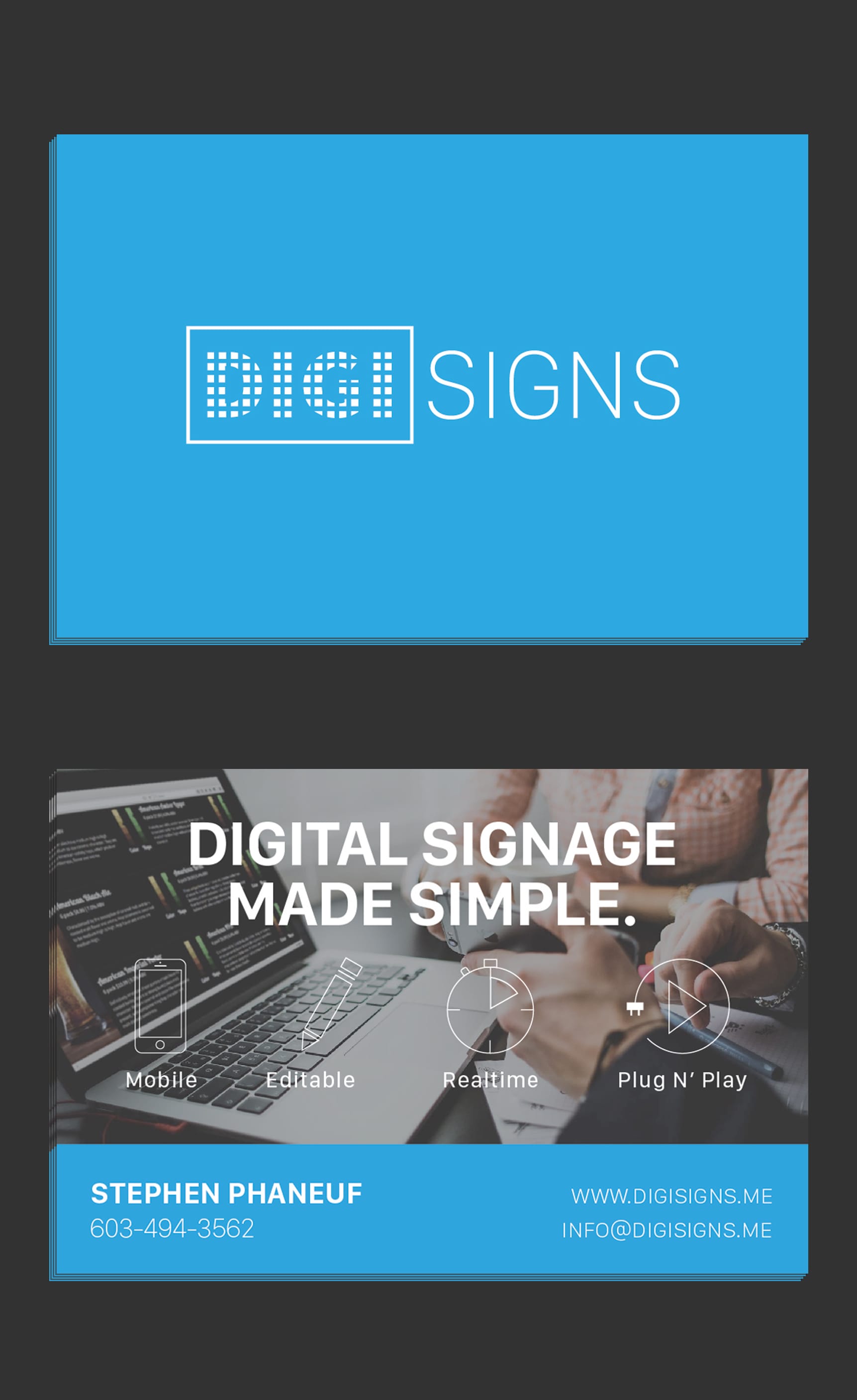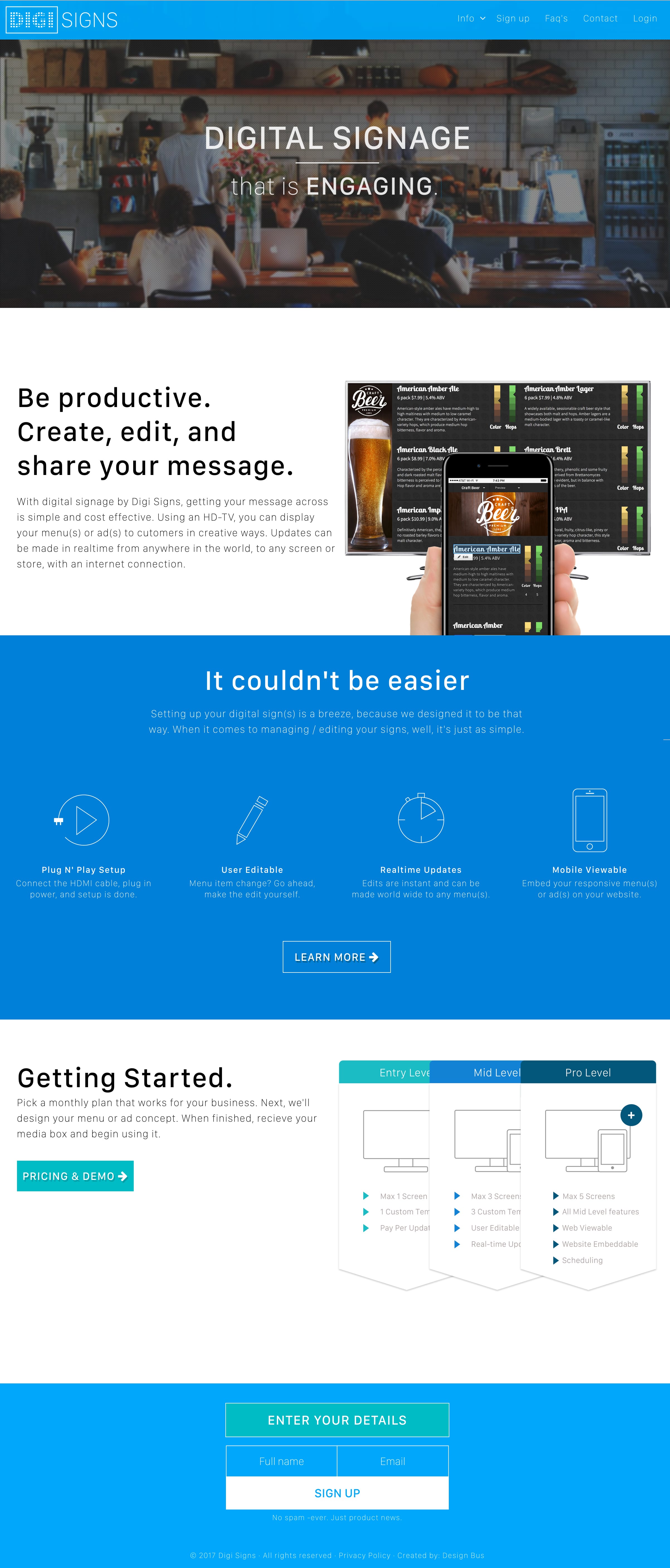 Digi Signs is a digital signage company that has created a simple solution for businesses to display their menu(s) or ad(s) to customers in creative ways. It's fully updatable allowing for changes to be made in realtime from anywhere. Design Bus was brought in to give a face to the company which included branding / logo design, web and print design, as well as developing an e-commerce solution allowing customers to sign up and pay online.